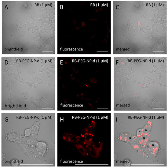 - RB-PEG-NP-b: RB was linked through its carboxylic group to the amine groups of NH-MSN (40 mg) by the carbodiimide method. This method has been previously described [105,109]. Briefly, NHS/EDC is added to RB in solution (0.03 mmol in 20 mL of CH3CN) in equimolar concentration and stirring for 1 h in an inert atmosphere. Then NH-MSN (40 mg) was directly added to the reaction mixture and kept stirring for 3 h, and nanoparticles were collected. In a second step, PEG (0.03 mmol) with a silylated group at one edge (Si-PEG, Figure 1) was externally anchored to the inherent hydroxyl groups of RB-MSN (40 mg) by direct condensation reaction during 3 h.