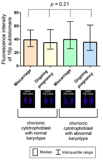 Column bar charts of 16p subtelomeric fluorescence intensity in the metaphase chromosomes from chorionic cytotrophoblast cells in karyotypically normal and abnormal miscarriages and ongoing pregnancies. The Kruskal–Wallis test showed no significant difference among the groups (p = 0.21).