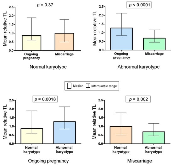 We compared mean relative TLs between the karyotypically normal samples from miscarriages and ongoing pregnancies. The Mann–Whitney U test showed no significance (p = 0.3739) (Figure 4). However, among the karyotypically abnormal chorion samples, mean relative TLs appeared to be significantly higher in ongoing pregnancies compared to miscarriages (p < 0.0001) (Figure 4). Moreover, when comparing mean relative TLs between chorion samples from karyotypically normal and abnormal ongoing pregnancies, we revealed significantly higher values in the abnormal karyotype cases (p = 0.0018) (Figure 4). In miscarriages, we observed the opposite picture: Mean relative TL values were higher in the karyotypically normal chorion samples (p = 0.002) (Figure 4). Therefore, our findings suggest a link between the mean relative TL in metaphase chromosomes from chorionic cytotrophoblast and both developmental capacity and normal/abnormal karyotype of the embryo.
