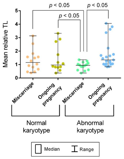 The karyotypically abnormal chorion samples from miscarriages comprised varying numerical chromosomal abnormalities, including trisomy 21, trisomy 16, trisomy 9, monosomy X, double trisomy 15 and 16 and triploidy. Meanwhile, the karyotypically abnormal chorion samples from ongoing pregnancies were all trisomic for chromosome 21. Therefore, to verify whether the comparison between the groups is reasonable, we first compared mean relative TLs measured in the trisomy 21 samples to those measured in the samples with other karyotype abnormalities within the group of karyotypically abnormal miscarriages. The Mann–Whitney U test showed no significance (p = 0.15).