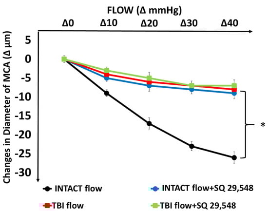 Changes in diameter of isolated middle cerebral arteries (MCAs) in response to step increases in intraluminal, flow (Δ0, Δ10, Δ20, Δ30, Δ40 mmHg between inflow and outflow cannulas) from intact rats and from rats after traumatic brain injury (TBI) in the absence and presence of SQ 29,548 (10−6 mol/L) an inhibitor of thromboxane A2 receptor (TP). Asterisks indicate significant differences * p < 0.05 vs. Intact flow and Intact flow with SQ 29,548 (n = 16, n = 8 in each group).