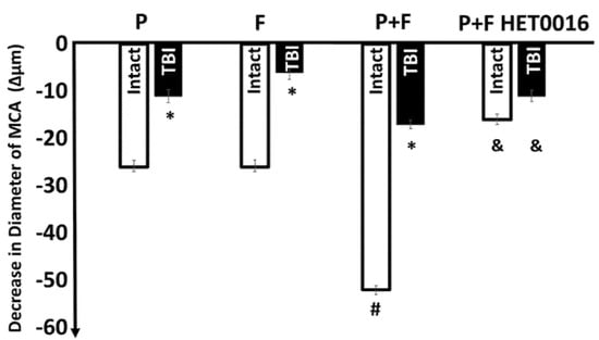 Shows the pressure (P)- or flow (F)-induced decreases in diameter alone, or the additive effect of pressure + flow on the diameter of MCA from intact rats. Additionally, Figure 2 shows that traumatic brain injury (TBI) significantly reduced the pressure (P)-, flow (F)-, and thus combined pressure + flow (P+F)-induced constrictions of MCAs (* indicates significant changes from Intact, # from P alone and F alone, and & from P+F (n = 24, data are mean ± SEM, p < 0.05) Moreover, this figure shows that HET0016 (10−6 mol/L), an inhibitor of cytochrome P450 4A (CYP450 4A), inhibited substantially and significantly the constriction induced by pressure + flow (n = 6 in each group).