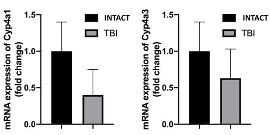 This figure shows the mRNA expressions of the cytochrome isoforms Cyp4a1 and Cyp4a3 in middle cerebral arteries (MCAs) of INTACT and TBI rats, which were substantially reduced after TBI (n = 6 in each group).