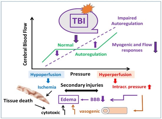 This figure shows the role of impaired pressure- and flow-sensitive mechanisms in the development of traumatic brain injury (TBI)-induced vasomotor dysfunction and brain edema. In normal, intact conditions, pressure- and flow-sensitive mechanisms maintain—in a wide range—a relatively constant cerebral blood flow despite of increasing perfusion pressure (autoregulation). After TBI, the impairment of these mechanisms develops, thus we propose that blood flow would increase as a function of pressure. In addition, in the lack of appropriate constrictions of larger and smaller arteries—not only CBF, intracranial volume and thus pressure increases as perfusion pressure increases—but also the distal microvessels—part of the blood brain barrier—become exposed to higher intraluminal pressure. These, together with the mediators released from the injured brain tissue, could lead to the opening of BBB, leakage of fluid, and various molecules, contributing to the development of edema and brain tissue injury.
