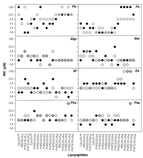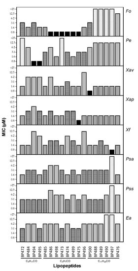 This set of 18 lipopeptides showed high antimicrobial activity (Figure 1). Concerning the antibacterial activity, 13 sequences exhibited MIC < 12.5 µM against the six bacteria tested. The results showed that they were more active against the three Xanthomonas strains than against E. amylovora or the Pseudomonas species. Twelve lipopeptides displayed MIC < 6.2 µM against the three Xanthomonas strains, among which nine showed MIC < 3.1 µM. Remarkably, an MIC between 0.8 and 1.6 µM against one of these strains was observed for three sequences.