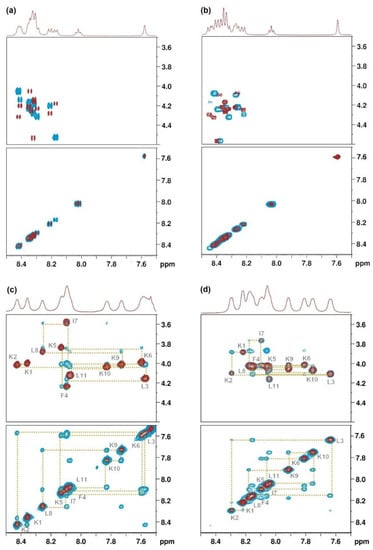 Next, the above experiments were conducted in the presence of 30% CF3CD2OD []. After the assignment of all the 1H, 13C and 15N signals, the primary structure of the peptides was confirmed based on the NOE correlation in the HN-Hα fingerprint region (Figure 2). Compared to the spectra recorded in H2O/D2O (9:1), in this case, all the HN-Hα cross-peaks could be unambiguously assigned and the analysis of the NOESY showed sequential correlations between amide protons. In addition, the “sequential walk” was achieved with the combination of NOESY Hα(i)-HN(i+1) inter-residue correlations and TOCSY Hα(i)-HN(i) intra-residue correlations. All these results pointed out that these lipopeptides adopt a secondary structure in the presence of CF3CD2OD.
