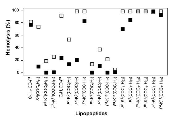 Hemolytic activity of the lipopeptides incorporating all L-amino acids or a D-amino acid. The x axis includes the code for each lipopeptide. The residue that can be an L- or a D-amino acid is indicated in italics. Hemolytic activity was measured at 250 µM and is expressed as a percentage compared to melittin as a standard. Black squares correspond to the hemolysis of lipopeptides with a D-amino acid, white squares to the hemolysis of lipopeptides with all L-amino acids, and grey squares indicate that both lipopeptides display the same hemolysis. Data can be found in Table S2 (Supplementary Materials).