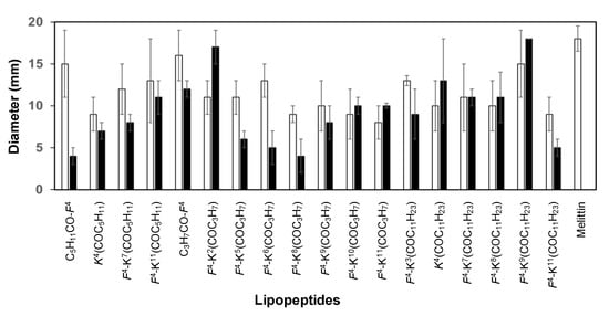 Effect of the lipopeptides incorporating all L-amino acids or a D-amino acid on the size of the lesions in infiltrated tobacco leaves at 250 µM. This effect was compared to melittin. Vertical bars within each column indicate confidence interval at the mean. The x axis includes the code for each lipopeptide. The residue that can be a L- or a D-amino acid is indicated in italics. Black bars correspond to lipopeptides with a D-amino acid and white bars to lipopeptides with all L-amino acids. Data can be found in Table S3 (Supplementary Materials).