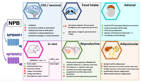 Beside its role in feeding behavior, in the CNS, NPB modulates locomotion and analgesia [11]. An i.c.v. injection of NPB in rats significantly increased locomotion in an open-field test in both the bright and dark phases. On the other hand, Hirashima et al. demonstrated that i.c.v. injection of NPB in mice reduced locomotor activity during the dark period, but not during the light phase. The activity of mice was measured using an infrared activity monitor [38]. In experiments using Npb−/− mice, no significant differences in activity levels were found compared to littermate controls [33].