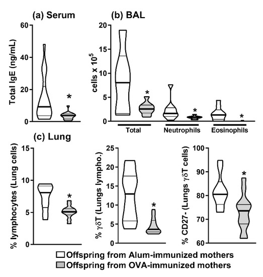 Using our previously described maternal allergen immunization protocol [6,27,43], we validated the offspring allergic response inhibition immunizing with OVA both offsprings, from OVA-immunized or Alum-immunized mothers, and evaluating some allergy-related biological parameters after pulmonary OVA-challenge. Total serum IgE and allergic pulmonary inflammation in response to OVA, as evaluated by the frequency of neutrophils and eosinophils in BAL analyses, were suppressed in offspring from OVA-immunized mothers (Figure 1a,b). Additionally, we observed that maternal OVA immunization decreased the frequency of infiltrating pulmonary lymphocytes in the offspring lung, and this was mainly mediated by the reduction of γδT cells infiltration (Figure 1c). Because thymic IL-17-producing γδT cells mainly express the CD27- phenotype, we further analyzed the frequency of CD27- γδT cells on the lung, where they could be detected at lower frequencies on offspring from OVA-immunized mothers (Figure 1c). These results validated our maternal OVA-immunization protocol inducing OVA tolerance and decreasing CD27- γδT cells’ frequency.