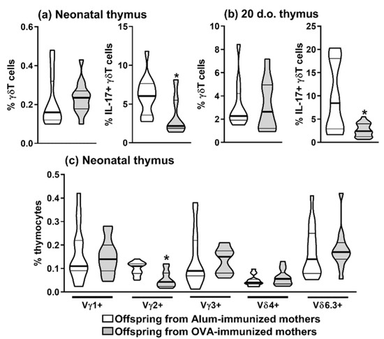 Inhibition of offspring thymic maturation of IL-17-producing and Vγ2+ γδT cells mediated by maternal immunization with OVA. Offspring from OVA-immunized (n = 9) or Alum-immunized (n = 10) mothers were evaluated. Thymic frequency of total and IL-17-producing (IL-17+) γδT cells were evaluated by flow cytometry at 3 (a) and 20 (b) d.o. offspring. Additionally, thymic frequency of Vγ1, Vγ2, Vγ3, Vδ4, and Vδ6.3 γδT cells was evaluated at 3 (c) d.o. offspring by flow cytometry. The results are illustrated with violin plot (truncated) representing median (bold line) and the quartiles (thin lines). *p ≤ 0.05 compared to Alum-immunized offspring.
