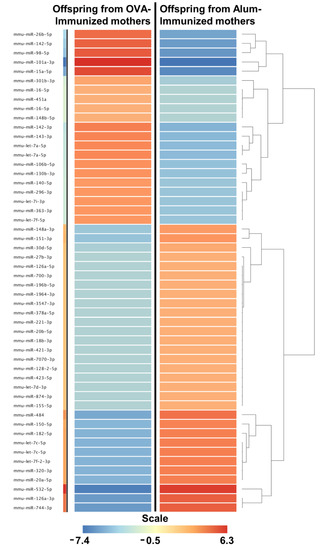miRNAs that were downregulated by maternal OVA immunization. The thymus of offspring from OVA-immunized (n = 10) or Alum-immunized (n = 11) mothers was evaluated at three days old. Unsupervised hierarchical clustering demonstrating 52 differentially expressed mature mmu-miRs between offspring OVA-immunized and Alum-immunized mothers. The mmu-miRs clustering tree is displayed to the right, forming two major clusters. The color scale at the bottom indicates the fold change expression levels of mature mmu-miRs across in both samples: red color indicates overexpression and blue underexpression.