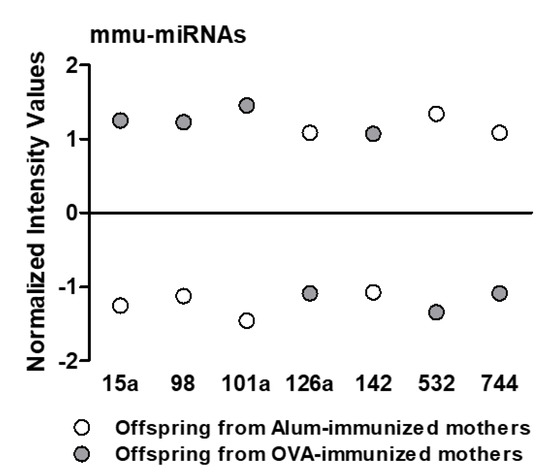 miRNAs that were substantially modulated between groups. The thymus of offspring from OVA-immunized (n = 10) or Alum-immunized (n = 11) mothers was evaluated at three days old. The dots showed the seven dysregulated miRNAs between offspring from Alum and OVA-immunized mothers. The fold change in these miRNAs was set at cut-off ≥4.