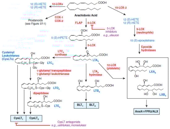 At the very beginning, the researchers focused investigations on the evaluation of the effects of NSAIDs on cyclooxygenase metabolism of arachidonic acid, but subsequent studies have shown that metabolites of the arachidonate 5-lipoxygenase (5-LOX) pathway “pro-inflammatory” cytokines such as tumor necrosis factor-alpha (TNF-α) and interleukin-1 (IL-1) may also play an important role in the modulation of various disorders since cytokines increase microvascular permeability and are potent chemotactic agents and attract eosinophils, neutrophils, and monocytes into the synovium [33,34]. Arachidonate 5-lipoxygenase pathway metabolites eicosanoids regulate a number of functions in T cells, including proliferation, apoptosis, cytokine secretion, differentiation, chemotaxis, and a wide array of physiological processes, starting from inflammatory processes such as asthma and allergies, to diseases such as cancer and AIDS [35]. The development of a new NSAIDs potential able to inhibit both cyclooxygenases and arachidonate 5-lipoxygenase have been started for a new therapeutic applications [36,37,38,39,40]. The dual-acting NSAIDs with dual inhibition of both COX and 5-LOX demonstrated neuroprotective effects by suppressing toxic actions of reactive microglia and macrophages, which are increased in the aging brain and in age-related degenerative conditions, such as Alzheimer’s and Parkinson’s diseases [36,37,41]. The dual-acting NSAIDs by blocking the 5-LOX pathway does not alter the synthesis of lipoxins (LXs), which are produced by lipoxygenation of 15(S)-hydroperoxyeicosatetraenoic acid (15(S)-HpETE), and which can have potent anti-inflammatory properties and can be considered as “stop-signal” mediators [36]. The lipoxygenase pathways of AA metabolism is presented in Figure 2.