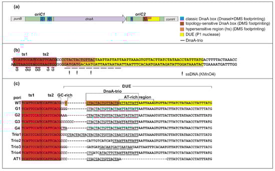 The E. coli model of chromosome replication initiation was proposed for a continuous oriC structure; the structure of the orisome formed on a bipartite oriC might differ. Both Helicobacter pylori (Figure 1A) and Bacillus subtilis oriCs are distinguished by a bipartite origin arrangement with two DnaA box clusters (oriC subregions 1 and 2) separated by the dnaA gene [,]. DnaA binds to both subregions, and due to DnaA–protein interactions between subcomplexes, loops out the dnaA gene [,]. The oriC1 (incAB) of B. subtilis encompasses 620 bps and contains 13 DnaA boxes, whereas oriC2 (incC) is 189 bp in length and consists of 7 DnaA binding sites (DnaA boxes 1-7) and the DUE [,,]. Not all DnaA boxes are required for the initiation of B. subtilis chromosome replication; however, oriC2 DnaA box 6 is essential but not sufficient for the origin replication in vivo []. The unwound region of B. subtilis oriC consists of six DnaA-trio repeats located at the beginning of the DUE [], followed by an AT-rich region. DnaA-trio (stringent consensus sequence 3′-GAT-5′) is a sequence bound as single-stranded DNA by a DnaA filament upon DUE unwinding. The DUE and the R1E. coli-type DnaA box (B. subtilis DnaA box 7) are separated by a GC-rich motif (5′-GGCC-3′) whose function remains unknown; please note that by the R1E. coli-type DnaA box, we assume the DUE proximal DnaA box as the box R1 in E. coli oriC, regardless of the sequence identity. The H. pylori oriC1 region (152 bps) contains four classic (c) topology-insensitive DnaA boxes c2-c4 with the conserved 5′-TYATTCACN-3′ consensus sequence (Figure 1A) []. OriC2 (228 bps) contains three DnaA boxes—one classic (c6) and two topology-sensitive (ts) binding sites (ts1, ts2)—and the DUE module located downstream of the ts boxes (Figure 1A,B) []. DnaA box ts2 directly precedes the DUE module; thus, it constitutes an R1E. coli-type DnaA box. The DnaA box ts1 is a low-affinity binding site that requires interactions with DnaA bound to DnaA box ts2 []. The H. pylori DUE module is composed of a DnaA-trio submodule []. The DnaA-trio submodule is separated from the DnaA box ts2 by a GC-rich sequence and is followed by an AT-rich region [] that begins with three 5′-ATT-3′ triplets, which may constitute an imperfect DnaA-trio. The oriC1 region is nonessential for DUE opening in vitro [], but it interacts with oriC2 via DnaA bound to box c6, resulting in DNA loop formation and remodeling of DUE-proximal oriC2; this can be observed as hypersensitivity of the DNA to DMS (hs region) []. However, the reason for this hypersensitivity remains unclear.