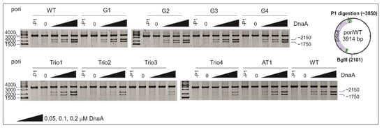 Unlike E. coli DnaA, which requires the assistance of HU protein to unwind DUE [], H. pylori DnaA unwinds oriC alone [,], and HU does not significantly affect DnaA unwinding activity (Figure S3). Thus, in our analyses, we used the most basic components of the P1 unwinding reaction. The wild-type and mutated plasmids were incubated with increasing concentrations of DnaA and treated with P1 nuclease, which digests single-stranded DNA. The P1-treated plasmids were further digested by BglII (P1/BglII) and resolved on agarose gels. The results of the P1/BglII analysis indicate that neither any modifications introduced within the GC-rich sequence (poriG1-4) nor deletion of 21 bps in the AT-rich module (poriAT1) significantly influenced the ability of DnaA to unwind the DUE region in comparison to poriWT (Figure 2). The introduction of three additional DnaA-trio repeats between the GC-rich sequence and the DUE (poriTrio1) did not affect the plasmid’s P1 susceptibility compared to the poriWT plasmid. Disruption of the motif or reversal of polarity of the DnaA-trio submodule (poriTrio2 and poriTrio3, respectively) inhibited the formation of ssDNA, indicating the relevance of the DnaA-trio motifs to DUE unwinding and possibly to assembly of the DnaA oligomer on the separated ssDNA strands. For the poriTrio4 plasmid containing a randomized DnaA-trio motif in which the variable nucleotides at the 1st and 3rd positions of the 5′-CTA-3′ motif were changed but the strictly conserved thymine residue was not modified, digestion of the DNA by P1 nuclease did not occur. This corroborates the hypothesis that although the residues at the 1st and 3rd positions are less conserved than the residue at the 2nd position, they are also important for DnaA-trio binding, and as a consequence, for DNA unwinding.