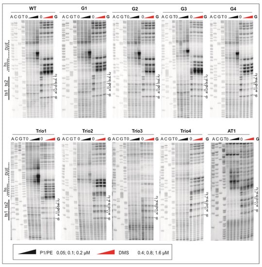 The DNA modifications introduced by DMS, KMnO4, or P1 nuclease (Sigma, Merck KGaA, Darmstadt, Germany) were monitored by PE analysis. The reaction conditions, mixture separation, and product visualization were described previously []. The gels were scanned using a Typhoon FLA 9500 (GE Healthcare, Chicago, IL, USA) and analyzed using ImageQuant (GE Healthcare, Chicago, IL, USA) and ImageJ (https://imagej.nih.gov/ij/ accessed on 13 June 2021).