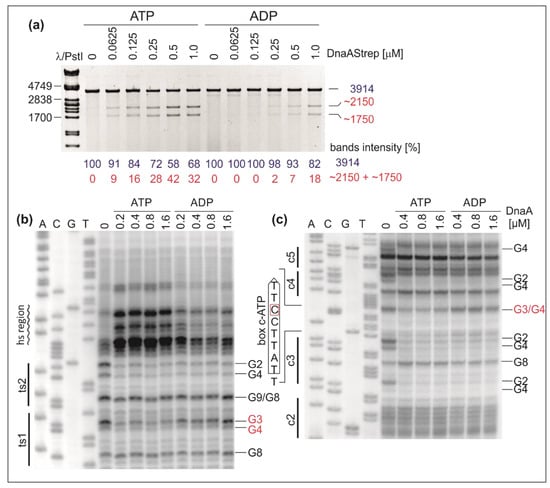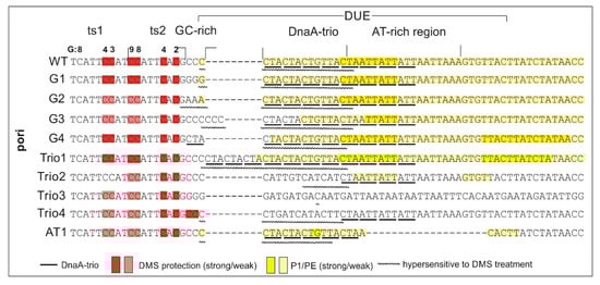 Next, the plasmids of the poriG1-G4 series were analyzed. The P1/PE products extended approximately up to 24 nt downstream of the ts2 DnaA box in each plasmid, indicating similar stability and length of the DnaA oligomer as in the poriWT (Figure 3, Figure 4 and Figure 5 and Figure S4). The hs regions in poriG1, poriG3, and poriG4 remained unchanged; however, in poriG2, the hs region was moved by 3 nt towards the ts2 DnaA box, possibly due to deletion of the GC-rich sequence that reduced the stability of dsDNA downstream of the ts2 DnaA box. DnaA boxes in poriG1 and poriG4 were protected as in the poriWT. Interestingly, the DMS footprinting indicated that in the poriG2 and poriG3, the G2 and G4 residues of DnaA box ts2 were bound similarly to that in the poriWT plasmid, but the DnaA interactions with G3/G4 and G8/G9 residues of DnaA boxes ts1 and ts2, respectively, were decreased (Figure 3, Figure 4 and Figure 5 and Figure S4; please compare the intensities of the bands/peaks of the above-mentioned guanine residues of the ts1-ts2 boxes with the band/peak representing the non-interacting G8 residue of the ts1 box). Therefore, we conclude that substitution of the GC-rich sequence by the AT-rich sequence—and in consequence premature DNA unwinding or elongation of the GC-rich tract—and oligomer formation shifting away from the ts2 DnaA box probably affected heretofore uncharacterized cooperation between proteins bound to the DnaA-trio and ts1 and G9/G8 residues of the box ts2.
