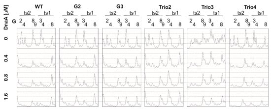 Next, the plasmids of the poriTrio1-Trio4 series were analyzed. The increased number of DnaA-trio repeats in poriTrio1 resulted in the formation of elongated oligomers assembled along 31 nt encompassing seven DnaA-trio repeats. The major P1/PE products were detected exactly at the same region as in the poriWT, i.e., within four last DnaA-trio repeats, which suggests that the DNA sequence (i.e., the lack of DnaA-trio motif) determines the end of the DnaA oligomer at the 3′ end or downstream of the DnaA-trio submodule. In other words, a DnaA filament is formed on ssDNA using the consecutive DnaA-trio motifs as long as they are present. The interactions of DnaA with the ts boxes of poriTrio1 remained unchanged. However, the major mutations in the DnaA-trio sequence led to marginal unwinding (poriTrio2) or lack of DUE opening (poriTrio3 and poriTrio4), confirming the results obtained by P1/BglII agarose gel analysis. DMS hypersensitive region in poriTrio2 was shifted away from ts boxes compared to the poriWT, and unlike in plasmids undergoing unwinding, the G residues in the GC-rich region were not significantly modified. There was only one G residue in the modified DnaA-trio region in poriTrio3; thus, it was impossible to determine the hs region modification. However, in poriTrio4, there were four consecutive guanine residues at the GC-rich region, which means that when modified, they should be clearly visible, as in the case for poriWT. However, they were barely modified by DMS (please compare the intensity of the bands in the hs region of poriTrio4 and poriWT). Altogether, P1/PE and DMS analyses indicated that without the DnaA-trio submodule, DnaA could not unwind and stabilize ssDNA, possibly because DnaA cannot assemble into the correct oligomer on ssDNA (Figure 3 and Figure 5). Interestingly, in all three plasmids, the DnaA interacted with G2/G4 of DnaA box ts2; however, the interactions with G8/G9 of DnaA box ts2 and G3/G4 of DnaA box ts1 were markedly reduced (Figure 3, Figure 4 and Figure 5 and Figure S3), indicating that DnaA bound to the DnaA-trio submodule stimulated or stabilized the interaction of DnaA with dsDNA box ts1 and the 5′ sequence of the DnaA box ts2.