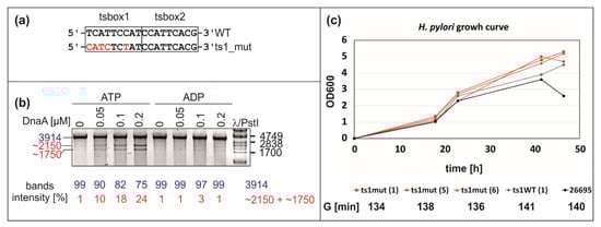 Analysis of the influence of the ts1 box mutation on the functionality of the oriC region. (a) The sequence of the wild-type and mutated ts1 box is shown. The mutated nucleotide residues are marked in red. (b) P1 nuclease analysis of the pori_ts1mut plasmid unwinding by ATP–DnaA and ADP–DnaA. After incubation with the indicated amounts of DnaA and ATP or ADP, the pori_ts1mut plasmid was treated with P1 nuclease, BglII digested, and resolved on 1% agarose gels. The sizes of the λ/PstI DNA ladder bands and the expected DNA restriction fragments (in base pairs) are indicated to the left and right of the gel images, respectively. (c) Analysis of H. pylori growth under microaerobic conditions. H. pylori was inoculated in Brucella broth with an OD600 = 0.005 and cultured microaerobically until a stationary phase of growth was reached. The growth curves of the wild-type (ts1WT), and three mutant clones (ts1mut) are shown. Generation times (G) were calculated for the H. pylori 26695 wild-type and mutant strains grown in liquid cultures for a time of approximately 0–18 h of growth.
