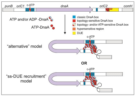 Schematic representation of possible H. pylori orisome structures on bipartite oriC. Boxes c-ATP and ts1 are bound exclusively by ATP–DnaA, whereas both DnaA forms, ADP-bound and ATP-bound, interact with classic DnaA boxes. The nucleotide status of the DnaA (ATP or ADP) forming the complete oligomer is unknown. The binding of DnaA to dsDNA leads to DNA unwinding. DnaA bound to ssDNA stabilizes the interaction of the protein with DnaA box ts1 either by recruitment of additional DnaA molecules (“alternative” model) or by simultaneous ssDNA and dsDNA binding (“ss-DUE recruitment” model). Whether or not there is additional stabilization/orientation of ssDNA–DnaA oligomer by DnaA bound to oriC1 of H. pylori is also an open question.