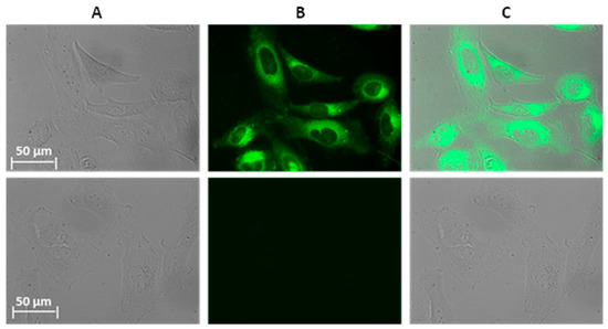 Results of epifluorescence microscopy experiments on living HeLa cells. (Top) after 1 h and 30 min of incubation with a 210 µM solution of the 4i probe. (Bottom) Untreated cells as a control. (A) Brightfield. (B) Fluorescence. λex: 417 nm band pass 60 nm filter, λem: 536 nm band pass 40 nm, τexp: 500 ms. (C) Merged. 40× objective.