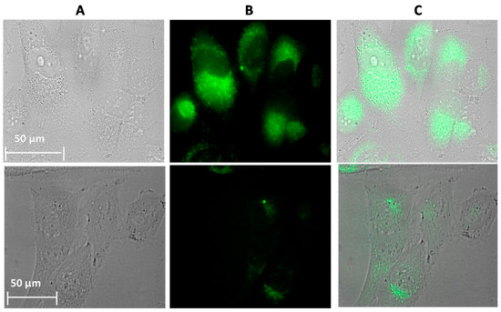 Images obtained from epifluorescence microscopy experiments on living HeLa cells. (Top) after 1 h and 30 min of incubation with 30 µM solution of the 3a fluorescent probe. (Bottom) Untreated cells as a control. (A) Brightfield. (B) Fluorescence. λex: 485 nm band pass 20 nm filter, λem: 525 nm band pass 50 nm, τexp: 300 ms. (C) Merged. 40× objective.