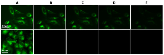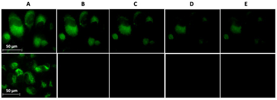 Images collected during photobleaching experiments. HeLa cells incubated (top) during 1h and 30 min with a 210 µM solution of the 4i probe or (bottom) during 30 min with 50 nM LysoTracker Green DND-26 after exposure to a continuous excitation light selected with a 417 nm (band pass 60 nm filter) collected at different times: (A) 0 s, (B) 30 s, (C) 75 s, (D) 180 s, (E) 485 s. The emission signal was collected with a 536 nm band pass 54 nm, τexp: 500 ms, 63× objective.