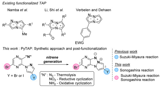Small-organic fluorophores have become tools of major importance for biological, biochemical and biomedical research but also for diagnosis [1,2,3]. Recently added in this field, 1,3a,6a-triazapentalene (TAP) has emerged and its uses as probes [4,5,6] or sensors [7] has been tested. Therefore, extensive synthetic studies have been reported on the 5/5 bicyclic scaffold in order to introduce structural diversities in order to improve its fluorescent property and/or its chemical stability [8]. However, the postfunctionalization remains delicate and thus the modulation of the existing TAP fluorophore is closely related to the few synthetic pathways reported in the literature (Scheme 1), i.e., substitution at position 2 and 4 [9], at position 2 [10], position 2 and 5 [11,12], at position 4 [13], at position 2, 6 [14], at position 3 [15,16] and at position 2, 3, 4 and 6 [17]. Recently, the development of a TAP system flanked with an additional fused heteroaromatic ring demonstrated a significant improvement in respect to the chemical stability while retaining promising spectroscopic properties [18,19]. This low molecular weight tricyclic framework is straightforwardly synthetized from either azides [18] or nitro derivatives [20,21] though a thermal activation or primary amines, ref. [19] followed by a mild oxidative cyclization in the presence of an hypervalent iodine. A preliminary postfunctionalization experiment was already reported since several aryl-substituted triazapentalenes were obtained through a Suzuki–Miyaura cross-coupling reaction [18]. Here, we investigate further the reactivity and the stability of these pyridazino-1,3a,6a-triazapentalene (PyTAP) toward Pd-catalyzed cross-coupling chemistry and other postfunctionalization. The spectroscopic properties of each compound resulting from these structural refinements was analyzed. The most promising compounds were tested for their ability to be used as fluorescent probes for the imaging of living HeLa cancer cells.