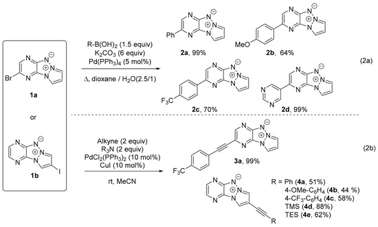 In the meantime, it is worth noting that the terminal alkyne reacted almost quantitatively in a Sonogashira reaction providing 4a in a 74% global yield from 1b vs. 51% considering the direct conversion (see Supplementary Materials for details).