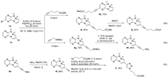 Introduction of ester (3a) and aminated (3b) groups through Sonogashira cross-coupling reactions. Introduction of ester (3c) group through a CuAAC reaction.