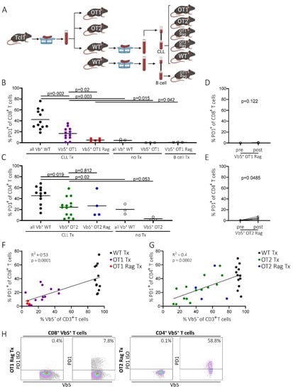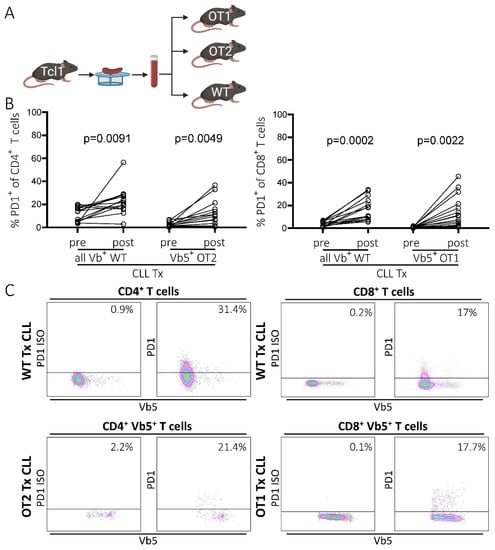 First, we compared the induction of PD1 upregulation on T cells as a surrogate marker for T cell exhaustion upon transplantation of CLL cells from the Tcl1 CLL mouse model into the congenic WT and OT1/OT2 mice as recipients (Figure 1A). OT1 and OT2 mice possess a fully rearranged transgenic TCR, highly specific for an ovalbumin-derived peptide restricted to either MHC-I (OT1) or MHC-II (OT2) (Figure S1A, left panel). As ovalbumin is not expressed in our mouse models, any T cells expressing the transgenic TCR, which are easily identifiable by staining with a TCR-Vb5-specific antibody, were defined as non-CLL-specific. As only a small percentage of endogenous Vb5pos T cells is present in WT mice (5.0% Vb5.1pos/5.2pos T cells (SD = 0.5; n = 6); []), only a small fraction of this Vb5pos population could potentially be tumor-specific within the OT mouse model. In line with our previous report [], we observed an induction of PD1 expression in CD4 as well as CD8 T cells in peripheral blood samples during disease development in CLL-transplanted congenic WT recipient mice (mean CD4: preTx 11.7%, postTx 23.2%, p = 0.0091, n = 14; mean CD8: preTx 3.6%, postTx 16.8%, p = 0.0002, n = 14) (Figure 1B,C). However, OT1 and OT2 recipient mice also exhibited robust PD1 expression in non-CLL-specific Vb5pos T cells, similar to the extent observed in CD4/CD8 T cells from WT recipients (mean OT2: preTx 2.3%, postTx 10.8%, p = 0.0049, n = 16; mean OT1: preTx 1%, postTx 13.5%, p = 0.0022, n = 16) (Figure 1B,C). Comparing CLL developments revealed that OT1 and OT2 recipients had accelerated leukemia development compared to WT recipients (50% TL: OT1 mean 30.6d, SD 7.7d, n = 16; OT2 mean 29.5d, SD 3d, n = 16; WT mean 32.3, SD 8.3, n = 12), resulting in a shortened overall survival (OS), particularly for OT1 recipients (OS: OT1 mean 31.2d, SD 6.7d, n = 16; OT2 mean 37d, SD 8.1d, n = 16; WT mean 42.7d, SD 7.7d, n = 14) (Figure S1B).