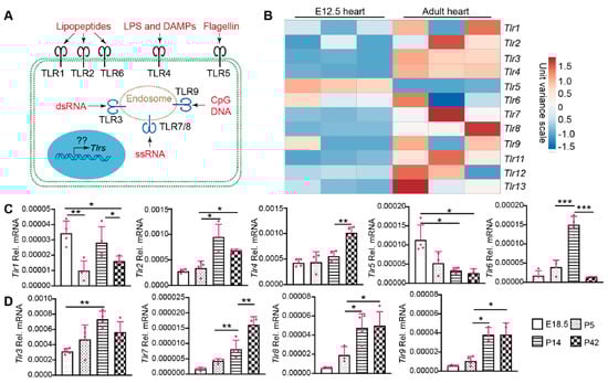 2.1. The Expression of TLR Genes Increases with Age during Postnatal Heart Development
