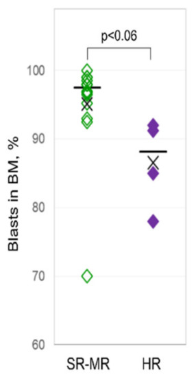 The recurrent cytogenetic aberrations comprised ETV6-RUNX1 in six patients (33%), hyperdiploid karyotype in four patients (22%), 9p deletion in three patients (17%), and TCF3-PXB1-translocation in two patients (11%). Three patients (17%) carried other cytogenetic aberrations. In the final risk stratification according to the pediatric international collaborative treatment protocol of the AIEOP-BFM ALL 2009 Registry, five patients (28%) belonged to the standard-risk group, nine patients (50%) to the medium-risk group, and four patients (22%) to the high-risk group. At diagnosis, high-risk pediatric ALL patients had a lower percentage of lymphoblasts in the bone marrow (Figure 1), and a higher percentage and count of lymphoblasts in their PB compared to the non-high-risk patients (Table 1).