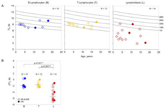 (A). Absolute telomere lengths of pediatric patients. Telomere lengths (TLs) in lymphoblasts (L) (right panel) compared to B-lymphocytes (B) (left panel) and T-lymphocytes (T) (central panel) in pediatric patients with ALL in relation to reference percentiles (grey lines) established from TLs of over 400 healthy individuals. (B). Age-adjusted telomere lengths of pediatric patients. Age-adjusted difference in telomere lengths (dTLs) in lymphoblasts (L) (right column) compared to B-lymphocytes (B) (left column) and T-lymphocytes (T) (central column). Pediatric patients with high risk (HR) are represented by filled diamonds, patients with standard risk (SR) and medium risk (MR) are represented by transparent diamonds. ** p < 0.001.