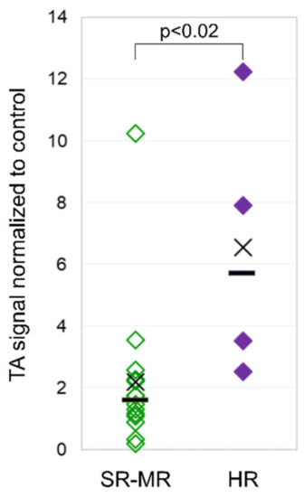 The mean TA in leukocytes of pediatric ALL patients at diagnosis was 3.2 TA/C (the telomerase activity signal was normalized to control the cell line) (range 0.2–12.3), and it was 0.7 TA/C (range 0.1–1.5) for the adult ALL patients. Pediatric patients stratified as high risk showed a significantly higher mean TA of 6.6 TA/C (range 2.5–12.3) than non-high-risk patients with 2.2 TA/C (range 0.2–10.3) (Figure 3). Despite the higher TA found in high-risk patients at diagnosis, they had a rapid and steady decline in TA during the induction treatment comparable to non-high-risk patients, reflecting the lack of TA in matured, non-leukemic leukocytes in the PB (data not shown).