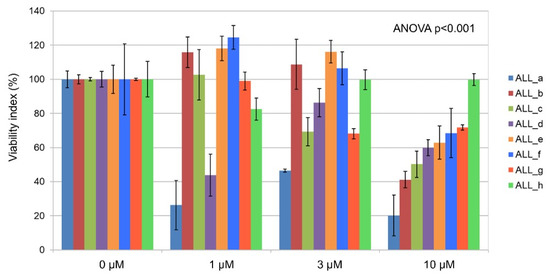 Ex vivo incubation of primary B-ALL lymphoblasts from patients with imetelstat induced significant (p < 0.001) dose-dependent proapoptotic effects (Figure 4). Lymphoblasts from patient samples cultured in the absence of imetelstat (=100%) compared to those cultured in the presence of 1 µM, 3 µM, or 10 µM imetelstat showed viability indices of 89.1 ± 2.6%, 87.7 ± 2.0%, and 59.3 ± 2.1%, respectively (mean ± standard error of the mean from triplicates).