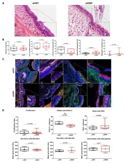 SNP rs16969968 is associated with a decrease in multiciliated cells in bronchi epithelia. (A) Representative micrographs showing the bronchial epithelia of α5WT- and α5SNP-expressing patients stained for haematoxylin and eosin. Magnification corresponding to the selected area is shown. (B) Box and whisker plots (median with min to max, the plus sign (+) represents the mean value) represent the measurements of epithelium height (µm), and the percentage of non-remodelled and remodelled (basal cell hyperplasia, goblet cell hyperplasia and metaplasia) epithelium in α5WT (black) and α5SNP-expressing (red) groups (n ≥ 7 for each group). (C) Representative micrographs showing the bronchial epithelia of α5WT and α5SNP-expressing patients stained for ciliated cells (Arl13b and FOXJ1, red), intermediate cells (uteroglobin, red), proliferative cells (Ki67, red), basal cells (P63, green), mucin-secreting cells (Muc5ac and Muc5b, green), intermediate filaments (vimentin, green) and cell nuclei (DAPI, blue). Magnification corresponding to the selected area is shown. (D) Box and whisker plots (median with min to max, the plus sign (+) represents the mean value) report the proportion of FOXJ1- and P63-positive cells per mm, the proliferative index, and the mean grey pixel values of mucin- and uteroglobin-associated fluorescence in α5WT (black) and α5SNP-expressing cells (red) (n ≥3 for each group). ** p < 0.01 α5WT vs. α5SNP.