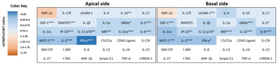 Cytokine and chemokine expression in AEC culture supernatants. Heat map colours correspond to the α5SNP/α5WT cytokine and chemokine ratios at ALI-7 from apical (left) and basal (right) supernatants obtained from AEC cultures (n = 4 α5WT and n = 9 α5SNP). Downregulated (blue) and upregulated (orange) proteins in supernatants from α5SNP-expressing cells are represented. Non-detected proteins are represented in white. * p < 0.05; ** p < 0.01; *** p < 0.001 α5WT vs. α5SNP.