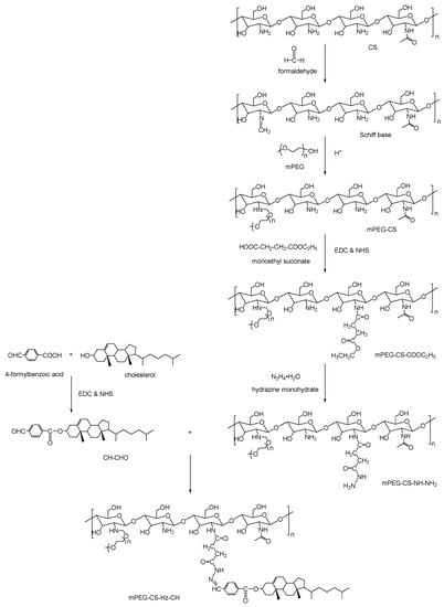 The copolymer mPEG-CS-Hz-CH was prepared by reactions involving several steps. First, 4-formylbenzoic acid was conjugated with cholesterol to form CH-CHO. Next, for CS, the modification by mPEG was performed to obtain mPEG-CS. Then, the mPEG-CS was functionalized with monoethyl succinate to obtain mPEG-CS-COOC2H5. After further reaction with hydrazine monohydrate, the mPEG-CS-NH-NH2 was obtained. Finally, the final product of mPEG-CS-Hz-CH was synthesized via the reaction between CH-CHO and mPEG-CS-NH-NH2.