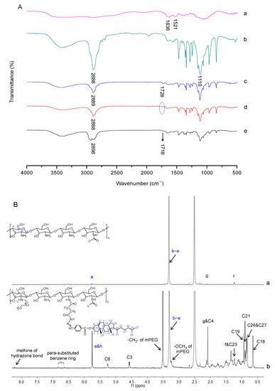 The successful synthesis of mPEG-CS-Hz-CH was verified by FT-IR analysis. As shown in Figure 2A, the FT-IR spectrum of CS showed characteristic peaks at 1638 cm−1 and 1521 cm−1, which were assigned to the C=O stretching vibration (amide I band) and N-H bending vibration (amide II band) of the amide link, respectively. For mPEG-CS, the new absorption peaks at 2888 cm−1 and 1110 cm−1 were ascribed to the -CH2- stretching vibration and C-O-C stretching vibration of mPEG, respectively [20]. For curve c, compared with mPEG-CS, the peak corresponding to the C=O stretching vibration of the ester bonds at 1728 cm−1 confirmed the successful formation of mPEG-CS-COOC2H5. In the spectrum of mPEG-CS-NH-NH2, the signal of ester bonds at 1728 cm−1 disappeared completely, which was important evidence of the synthesis of mPEG-CS-NH-NH2. As for mPEG-CS-Hz-CH, the typical peak of C=O stretching vibration at 1718 cm−1 was attributed to the ester bonds from CH-CHO, which indicated the introduction of CH-CHO. More importantly, the characteristic absorption peak of the hydrazone bond corresponding to the stretching vibration of C=N was observed at 1601 cm−1 [21]. All these differences indicated the formation of mPEG-CS-Hz-CH.