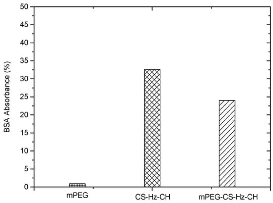 When the drug-loaded micelles enter the bloodstream, the non-specific protein adsorption might trigger a series of undesirable reactions, which would reduce the therapeutic effect of the drug. More specifically, the protein corona would lead to the opsonization of the particles, and the micelles would be easily captured and eliminated by the reticuloendothelial (RES) system. In this study, considering the positive charges on the surfaces of the prepared micelles, negatively charged bovine serum albumin (BSA) was used as a model protein to evaluate the interaction of mPEG-CS-Hz-CH micelles with the protein. As illustrated in Figure 5, CS-Hz-CH displayed significantly high BSA adsorption, with a value of 32.6%. This was mainly due to the strong electrostatic interaction between BSA and CS-Hz-CH. After mPEGylation, the protein adsorption value dramatically decreased to 24.0%, which indicated the significant role of mPEG. Due to its hydrophilic nature and electrical neutrality, mPEG could form a strong hydration layer on the surfaces of the micelles, and the long chain of mPEG could provide high elastic repulsion energy to decrease the interaction between BSA and the particles [27]. It was also reported that the modification by mPEG could protect the micelles from being taken up by the MPS, and a prolonged blood circulation time and enhanced potency of the drug could be obtained [28].