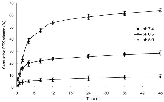 The in vitro drug release performance of PTX-loaded mPEG-CS-Hz-CH micelles was investigated under different pH conditions, and the results are presented in Figure 6. In the simulated physiological medium (pH 7.4), the cumulative release percentage of PTX was only 8.7 ± 1.8%, which indicated that the micelles were stable in the normal physiological environment. In comparison, the micelles exhibited an accelerated drug release profile in acidic media, with the cumulative release percentage reaching 28.2 ± 2.1% at pH 6.5 (stimulating the microenvironment of tumor tissue) and 63.8 ± 1.9% at pH 5.0 (stimulating the cytoplasm and endolysosomes of tumor tissue). It was obvious that the drug release behavior of mPEG-CS-Hz-CH micelles was influenced by the pH value, and the lower pH triggered the drug release from the micelles. In an acidic environment, due to the cleavage of hydrazone bonds, the structure of the micelles becomes loose and unstable, thus leading to rapid release of the drug. It could be deduced that the drug release from the micelles might display selectivity in the tumor, which would enhance the drug’s therapeutic efficacy and reduce its toxicity to normal tissue.