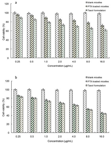 In vitro cytotoxicity of the PTX-loaded mPEG-CS-Hz-CH micelles against (a) MCF-10A cells and (b) MCF-7 cells.