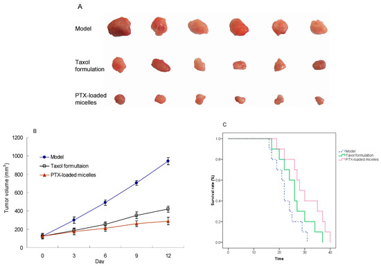 H22 tumor-bearing mice were used to further evaluate the in vivo antitumor activity of the PTX-loaded mPEG-CS-Hz-CH micelles. H22 transplanted mouse models were established via the subcutaneous injection of 100 μL of H22 cell suspension (containing 2 × 106 cells) into the right flank of each mouse. When the tumor became palpable (set as day 0), the mice were weighed and randomly divided into three groups (n = 6), which were treated with normal saline, Taxol (PTX of 15 mg/kg) and PTX-loaded micelles (PTX of 15 mg/kg). Samples were administrated through tail vein injection on days 0, 3, 6 and 9. The tumor size was monitored every 3 days to estimate the tumor volume via Equation (4). At the end of the experiment (day 12), the mice were sacrificed. The tumor tissues were excised, measured, weighed and photographed. The tumor inhibition rate (TIR) was calculated to evaluate the antitumor efficacy of the PTX-loaded micelles quantitatively.