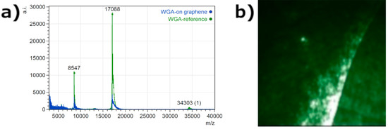 (a) MALDI spectra overlaying the reference spectrum of WGA (green), and the spectrum acquired on functionalized graphene after incubation with WGA (blue). The dominant masses in both spectra are 8.5, 17.1, and 34.3 kDa. (b) Fluorescence imaging of a graphene edge functionalized with GlcNAc after incubation with fluorescently labeled (fluorescein isothiocyanate, FITC) WGA. A clear contrast is observed at the edge of functionalized graphene.