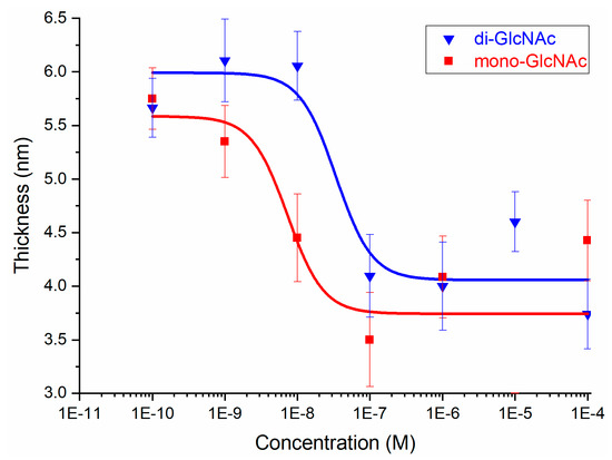 An important feature of carbohydrate binding to lectins is the previously shown affinity increase [24] by approximately one order of magnitude when extending the chitooligomer by a single GlcNAc unit. We thus performed a binding assay in which WGA bound to GlcNAc-functionalized graphene was competitively released from the surface by the addition of the monomeric ligand in the solution (see also Supplementary Figure S2). Figure 5 summarizes the AFM measurement of the layer thickness of graphene decorated with mono- or di-GlcNAc on the surface after competition with a gradually increasing concentration of mono-GlcNAc in solution. At low concentrations of the mono-GlcNAc competitor, the layer thickness showed constant values of 5.5–6 nm, indicating the presence of WGA bound to the surface. At a mono-GlcNAc concentration of about 10−8 M, the layer thickness suddenly dropped to values corresponding to the functionalized graphene without WGA. The physical nature of AFM measurement did not allow us to obtain experimental points in the descending slope of the sigmoidal curve. The experimental data were fitted with the Hill function with a fixed Hill coefficient of 1.75 (positive cooperative binding) based on previous studies37 and provided dissociation constants of 7.3 × 10−9 and 3.4 × 10−8 M for mono- and di-GlcNAc-functionalized graphene, respectively. For tri-GlcNAc and longer chitooligomers grafted on graphene, the competition with mono-GlcNAc did not proceed even at high competitor concentrations (10−3 M GlcNAc), indicating that mono-GlcNAc is not an efficient competitor for tri- and longer chitooligomers immobilized on the graphene surface.