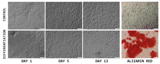 As it is presented in Figure 2, the initially seeded cells exhibited a fibroblast-like elongated shape, typical for ASC cultures. After several days in culture (day 5), the cells presented a flattened, epithelial-like morphology, resulting from the increase in confluency. On day 13, at the end of the culture period, significant differences between the control and differentiated cells can be observed. While the control sample presents densely packed cells with a morphology typical for late cultures of >90% confluency, differentiated cells are small and more sparsely connected. After Alizarin Red staining, intense red coloring could be observed in the differentiated samples, while controls did not exhibit any color change.