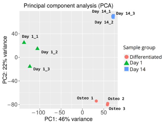 The RNAseq analysis of the samples was performed at CeGaT GmbH (Tübingen, Germany) using the Illumina platform (Illumina, San Diego, CA, USA). The samples consisted of three biological repeats for each of the analyzed culture periods, with three sets of day 1, day 14 and osteogenic samples obtained from three different animals, in order to correct for inter-specimen differences. Before the analysis, additional quality control of the samples was performed using Qubit RNA (Thermo-Fischer Scientific, Waltham, MA, USA) and Bioanalyzer RNA (Aglient Technologies, Santa Clara, CA, USA). RNA integrity numbers (RINs) of the samples were determined at values between 9.3 and 10, allowing for further processing. The cDNA library used for the subsequent analysis was prepared from 100 ng of RNA per sample using TruSeq Stranded mRNA kit (Illumina, San Diego, CA, USA). The sequencing was performed using NovaSeq 6000 (Illumina, San Diego, CA, USA). Afterwards, demultiplexing of the sequencing reads was performed using bcl2fastq (v. 2.20), with adapters trimmed with Skewer (v. 0.2.2) [86]. The trimmed raw reads were aligned to the CanFam3.1 canine genome using STAR (v. 2.5.2b).