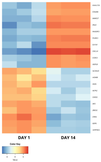The long-term in vitro culture of ASCs (day 14 vs. day 1) resulted in differential regulation of 3528 genes (1998 upregulated and 1536 downregulated), out of the total of 19,586 genes detected during the analysis (out of which 13,539 were successfully annotated with an Ensembl gene ID). In turn, similar parameters after osteogenic differentiation were presented by 3087 genes in relation to day 1 (1517 upregulated, 1570 downregulated) and by 1484 genes in relation to day 14 (548 upregulated and 963 downregulated). Out of these three gene sets, the 10 most up- and downregulated genes were selected for further analysis and are presented in the form of log2FC heatmaps (Figure 5, Figure 6 and Figure 7) and compiled in Table 1, together with their particular fold changes and adjusted p values.